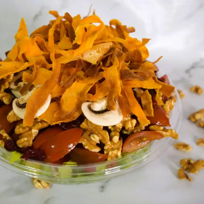 עגבניות שרי, פטריות,חסה לליק, אגוזי מלך,פקאן מסוכר ובטטה קריספית