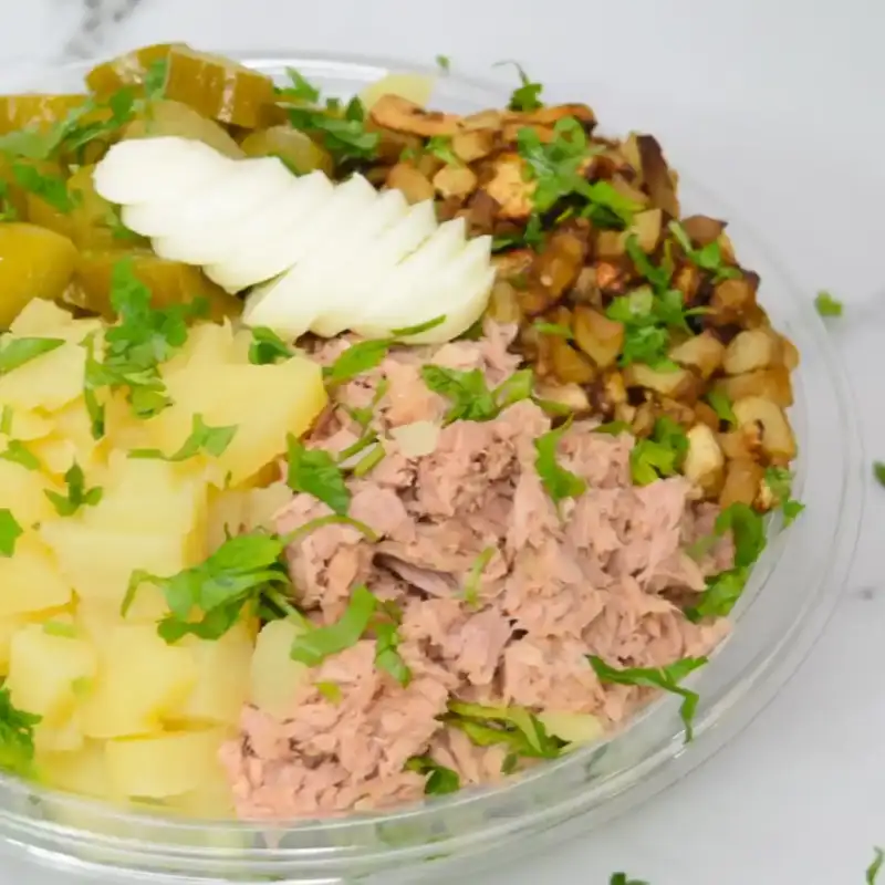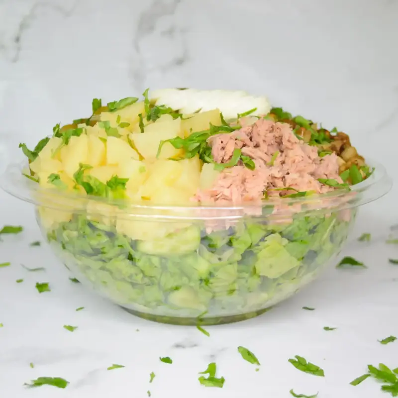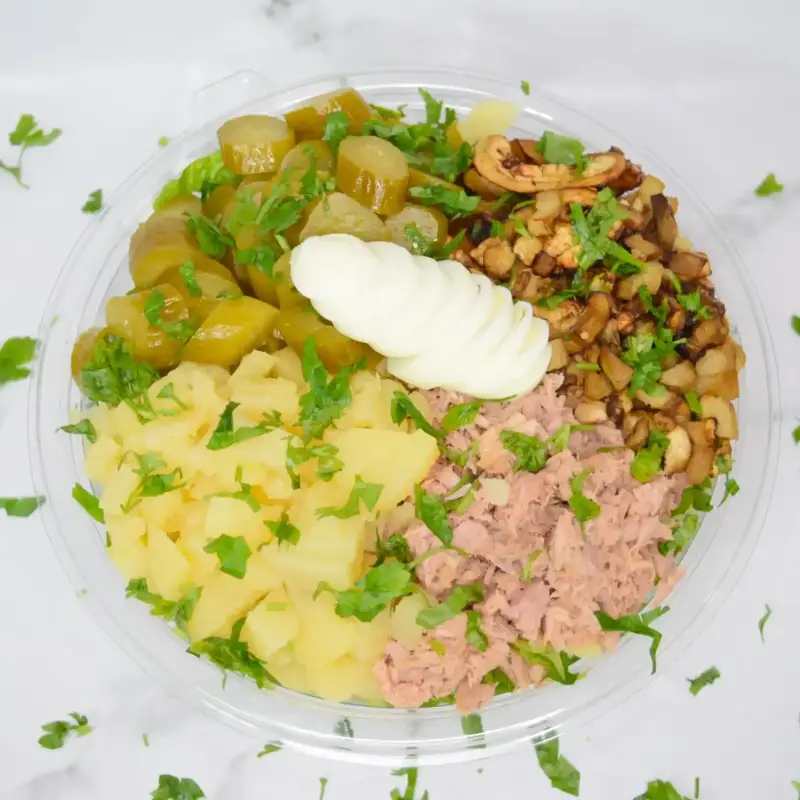 מלפפון,חסה,ביצה, טונה,קוביות חציל ,מלפפון חמוץ ותפוא מבושל