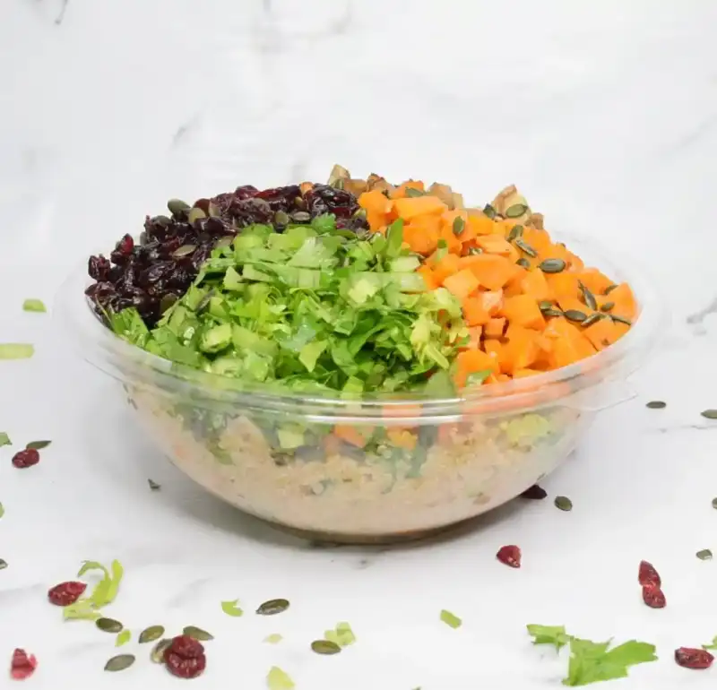 קינואה לבנה, קוביות בטטה וחציל אפויות,עשבי תיבול,חמוציות וגרעיני דלעת