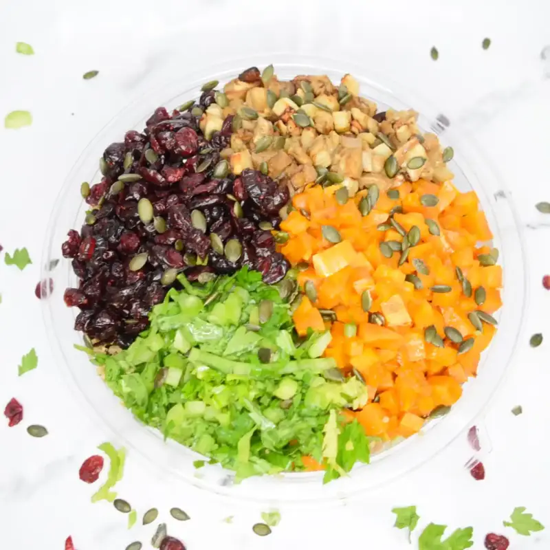 חסה לליק, סלרי,פטרוזיליה תפוח עץ ירוק, חמוציות ,אגוזי מלך ,פקאן מסוכר,גרעיני חמניה וגרעיני דלעת