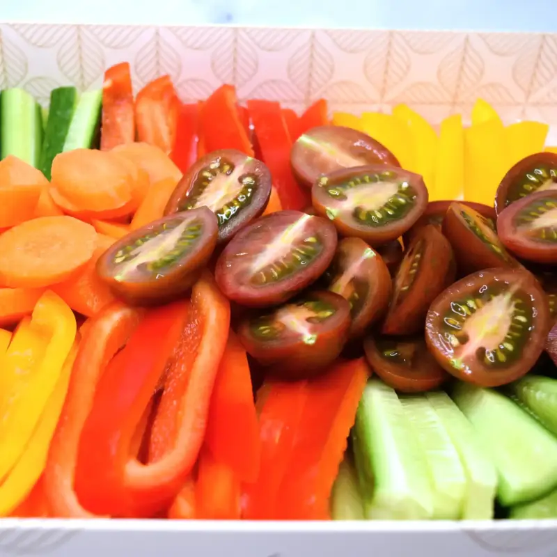 רצועות של מלפפון, גזר,גמבה אדומה וצהובה, עגבניות שרי,ומטבלי שום ווינגרט הדרים